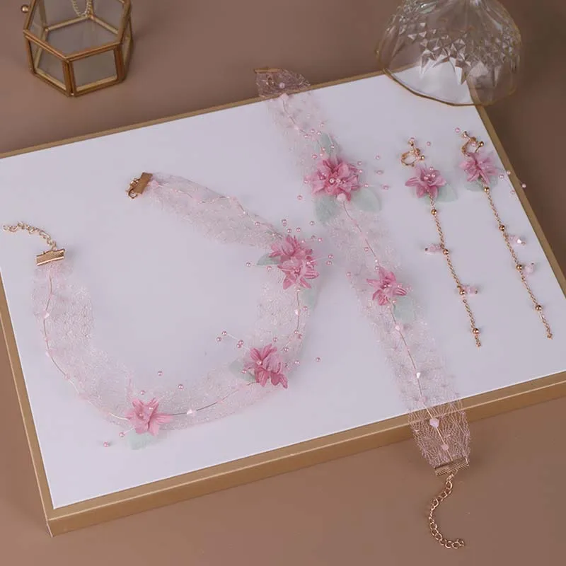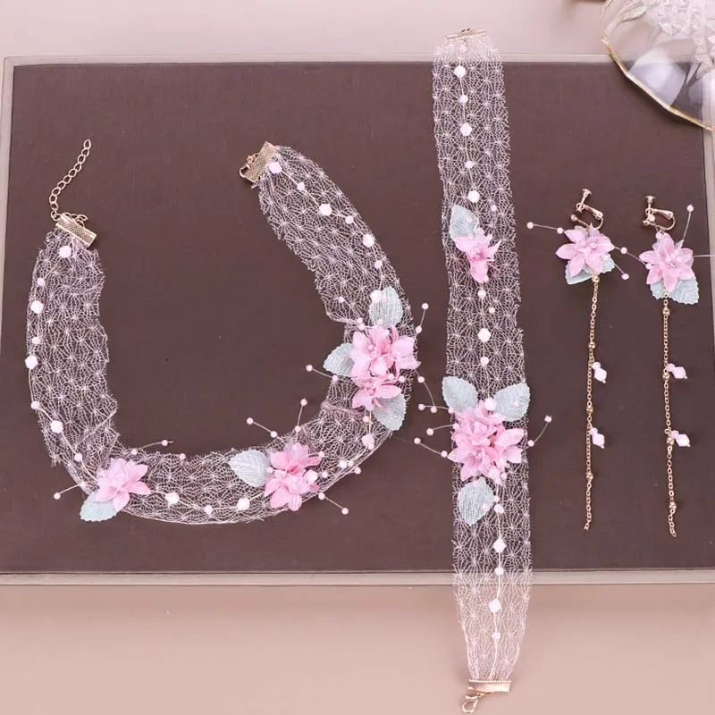 Korean Jewelry Set Sweet Pink Flower Women Hairband Long Tassel Earrings Set Lace Necklace Tiaras B