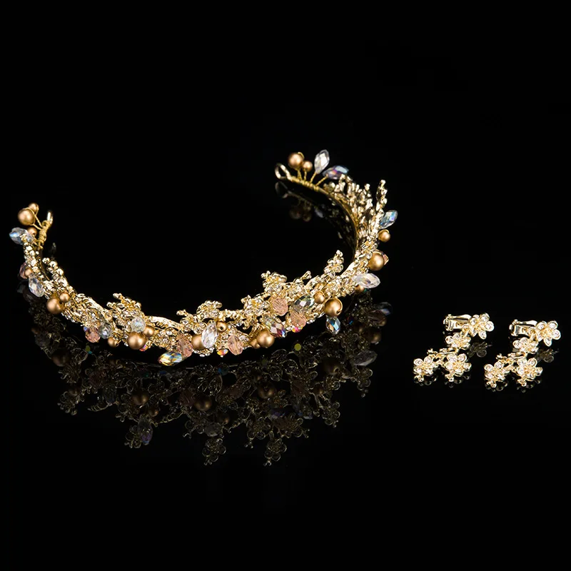 TREAZY Handmade Gold Color Crystal Floral Bridal Tiara with Earrings Wedding Crown for Bride Weddin